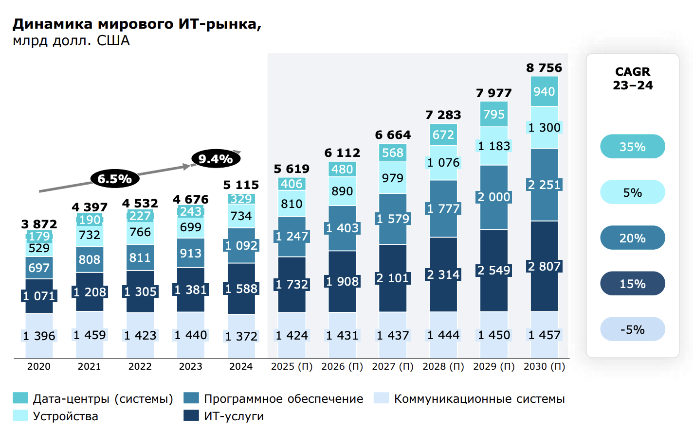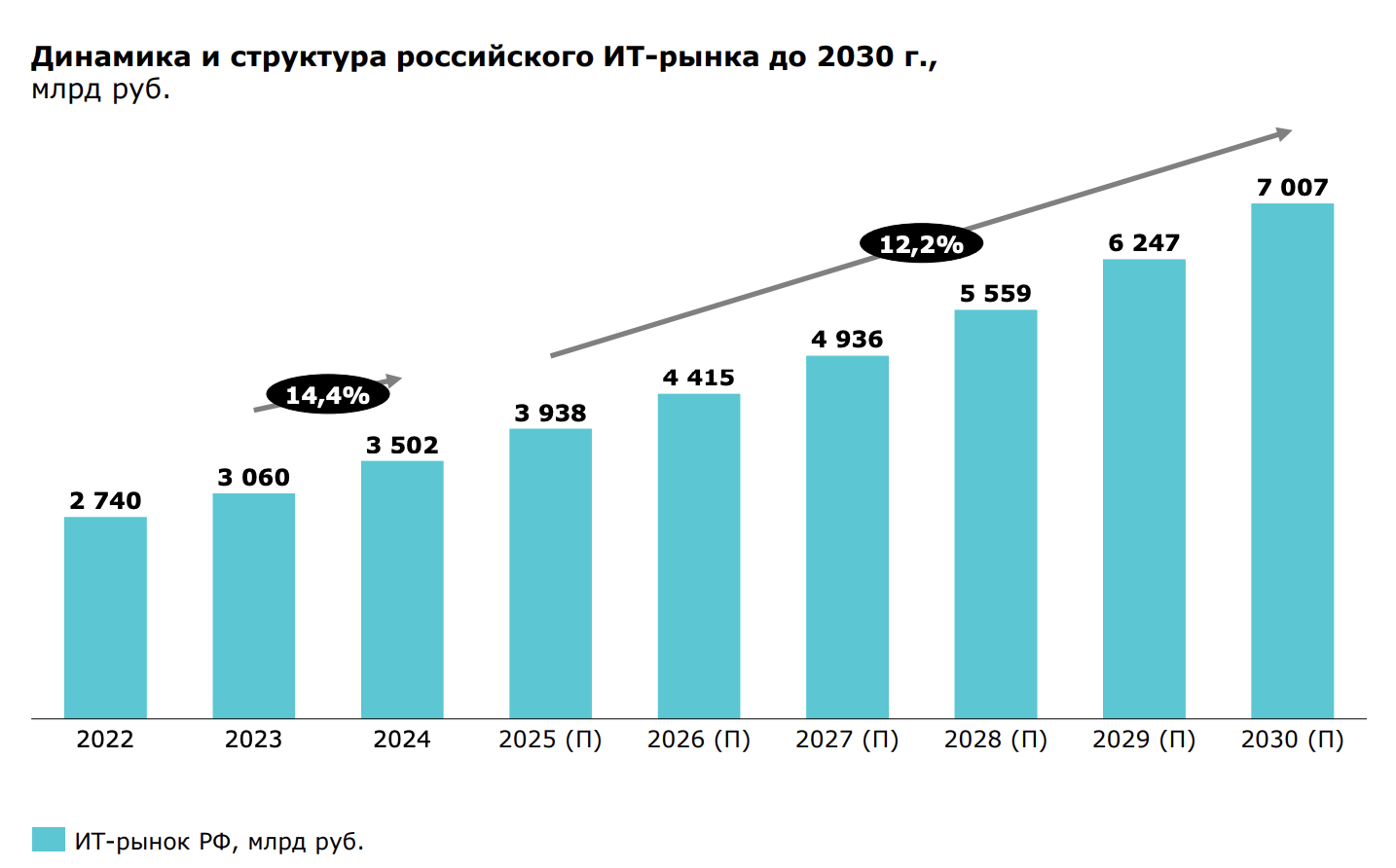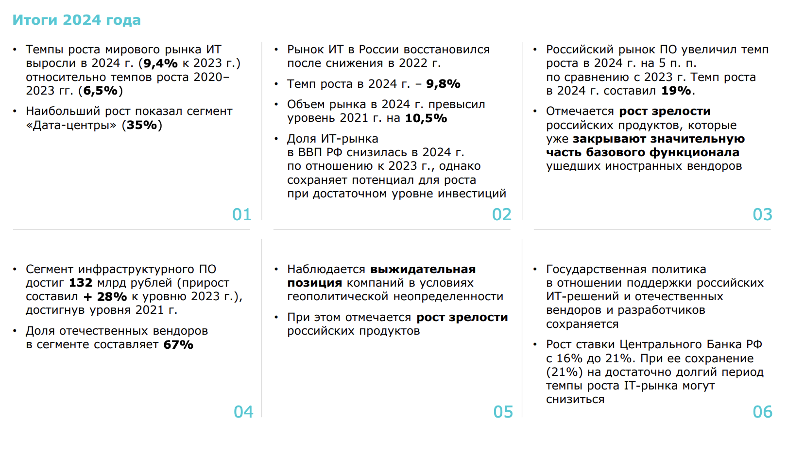 В начале 2025 года темпы роста российского ИТ-рынка замедлились на фоне высокой ключевой ставки, что стало ожидаемым явлением. Однако курс на переход к отечественным решениям сохраняет стратегическую значимость и остается приоритетом государственной и корпоративной политики. По мере стабилизации макроэкономической ситуации ожидается возобновление активного роста в 2026–2027 годах.
