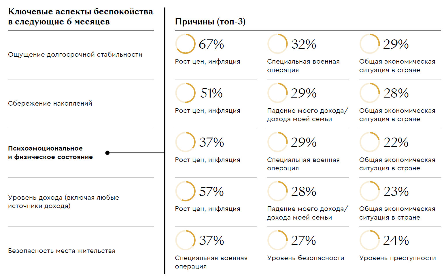 При этом снизилась обеспокоенность уровнем доходов (–31 п.п.) и состоянием здоровья (–11 п.п.), тогда как выросли тревоги, связанные с сохранением накоплений (+11 п.п.) и долгосрочной устойчивостью (+5 п.п.). Главными источниками беспокойства остаются рост цен, военные события и общая экономическая ситуация.