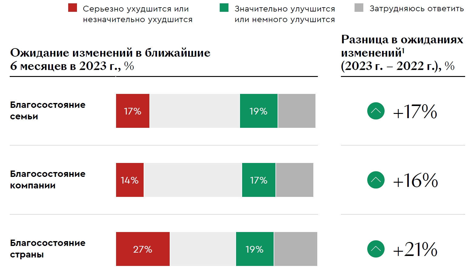 «В целом по сравнению с прошлым годом ожидания относительно будущего значительно улучшились: респонденты ожидают улучшения и в положении своей семьи, и в компании, где они работают, и в стране. Разница в ожиданиях составила от 16 до 21% и по большинству показателей оказалась в «зеленой» зоне, при этом наибольшую положительную динамику показали ожидания относительно благосостояния страны в целом. При этом большая часть россиян ментально подстроилась к новой реальности. Доля респондентов, указывающих, что возврат к прежней жизни невозможен, возросла в два раза – с 20 до 40%»