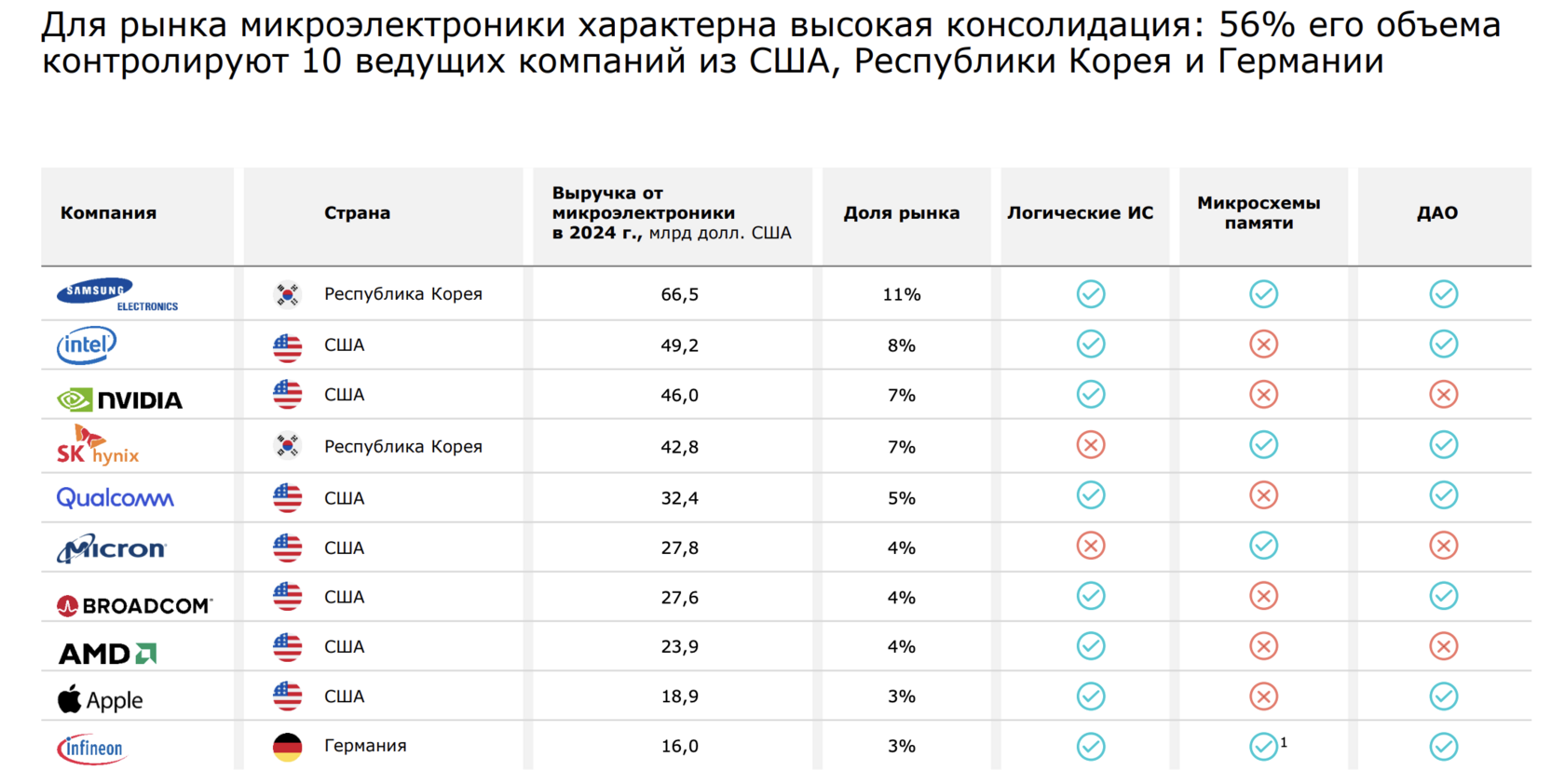 Мировой рынок микроэлектроники в 2024 году восстановился за счет высокого спроса на графические процессоры и ИИ-компоненты. К 2030 году его объем достигнет 1 трлн долларов при среднегодовом росте в 8%.