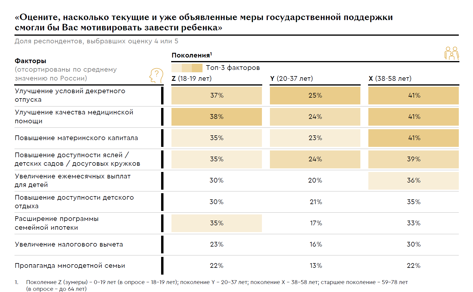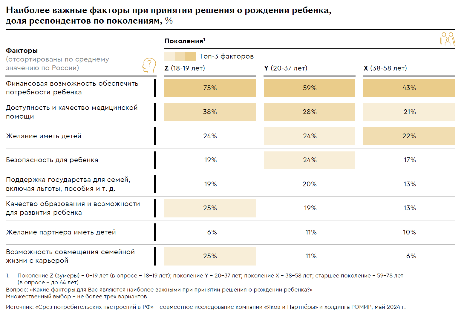 «Для всех респондентов вне зависимости от их возраста, уровня дохода и места жительства главным фактором при принятии решения о рождении ребенка остаются финансовые возможности. При этом факторы, влияющие на решение завести ребенка, практически одинаковы у женщин и мужчин. Для респондентов в возрасте 18–19 лет в число главных факторов входят также качество образования (25%) и возможность совмещения семейной жизни с профессиональной карьерой (25%). А для опрошенных жителей городов-миллионников, за исключением Москвы и Санкт-Петербурга, вторым по значимости фактором является безопасность для ребенка (23%)»