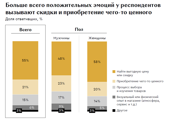 Основным источником положительных эмоций при покупках остаются скидки: их отмечают 55% опрошенных. Женщины получают удовольствие от этого чаще (58%), чем мужчины (48%), тогда как мужчины в два раза чаще ценят сам процесс и визуальный опыт покупок (9% против 5%).